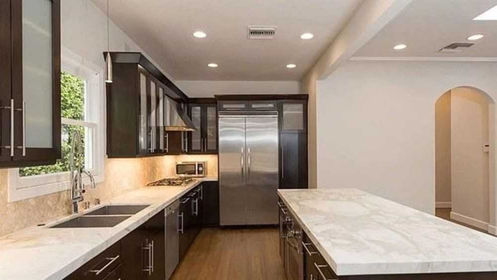 The open kitchen includes white marble countertops and wooden cabinets filled with stainless steel appliances.