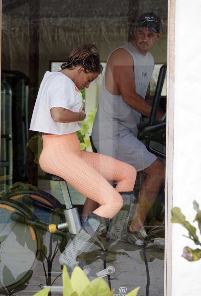 After the singer completed her exercises, Woods carried her boyfriend on his lap to the car.