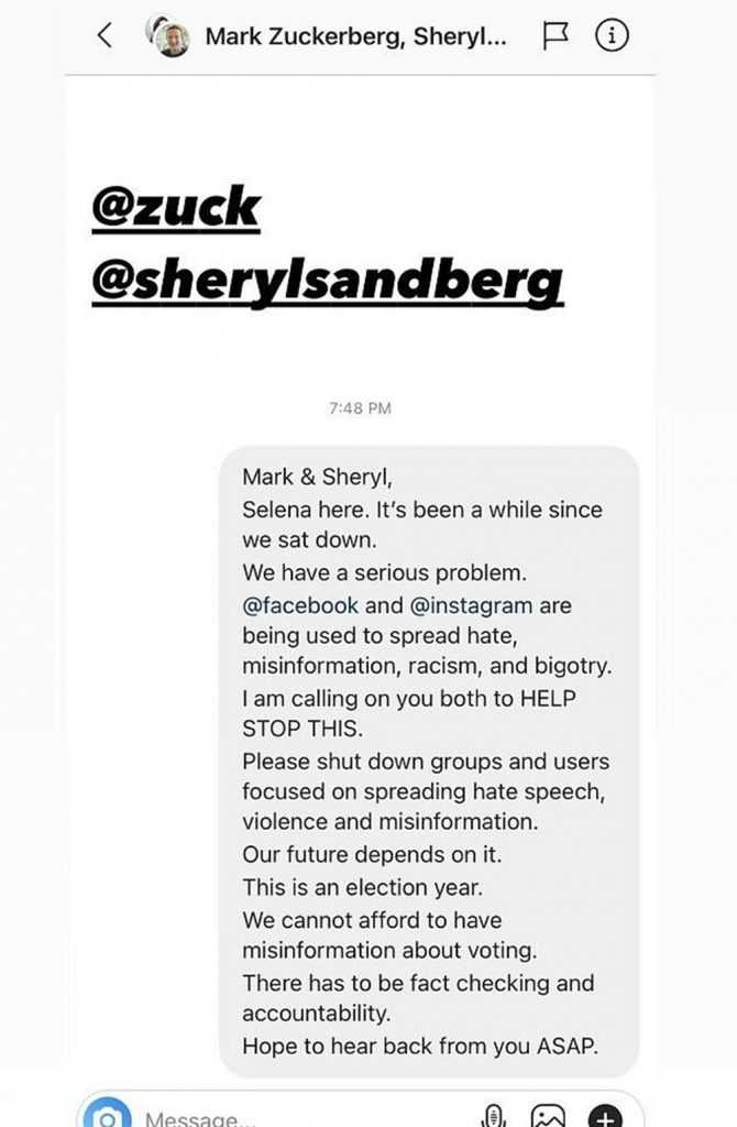 Starting her message, “We have a serious problem,” Gomez said, “Facebook and Instagram are spreading hatred, misinformation, racism and fanaticism. “I urge you both to help stop this,” she said.