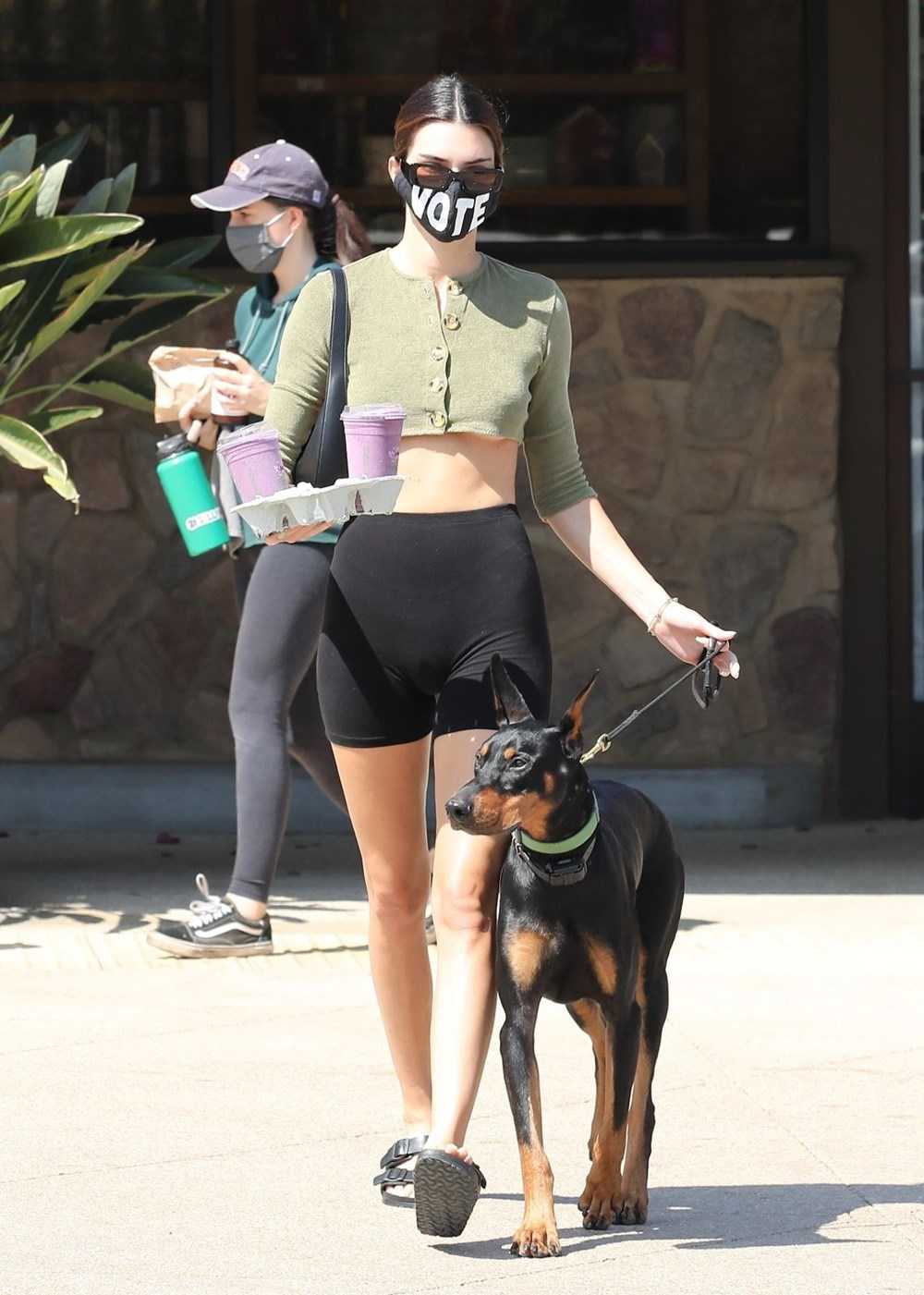 American model Kendall Jenner (24) a mask carrying a political message while taking her dog Pyro out for a ride.