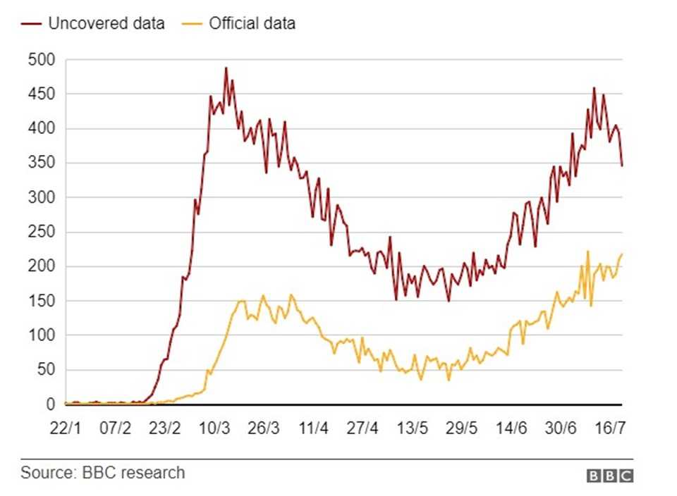 The BBC explained that the details on the lists match the data of the international follow-up centers, suggesting that the actual number of cases in the country is almost twice that of the description. Accordingly, on July 20, 451 thousand people in the country had burned Covid-19, but the government announced only 278 thousand 827 of them.