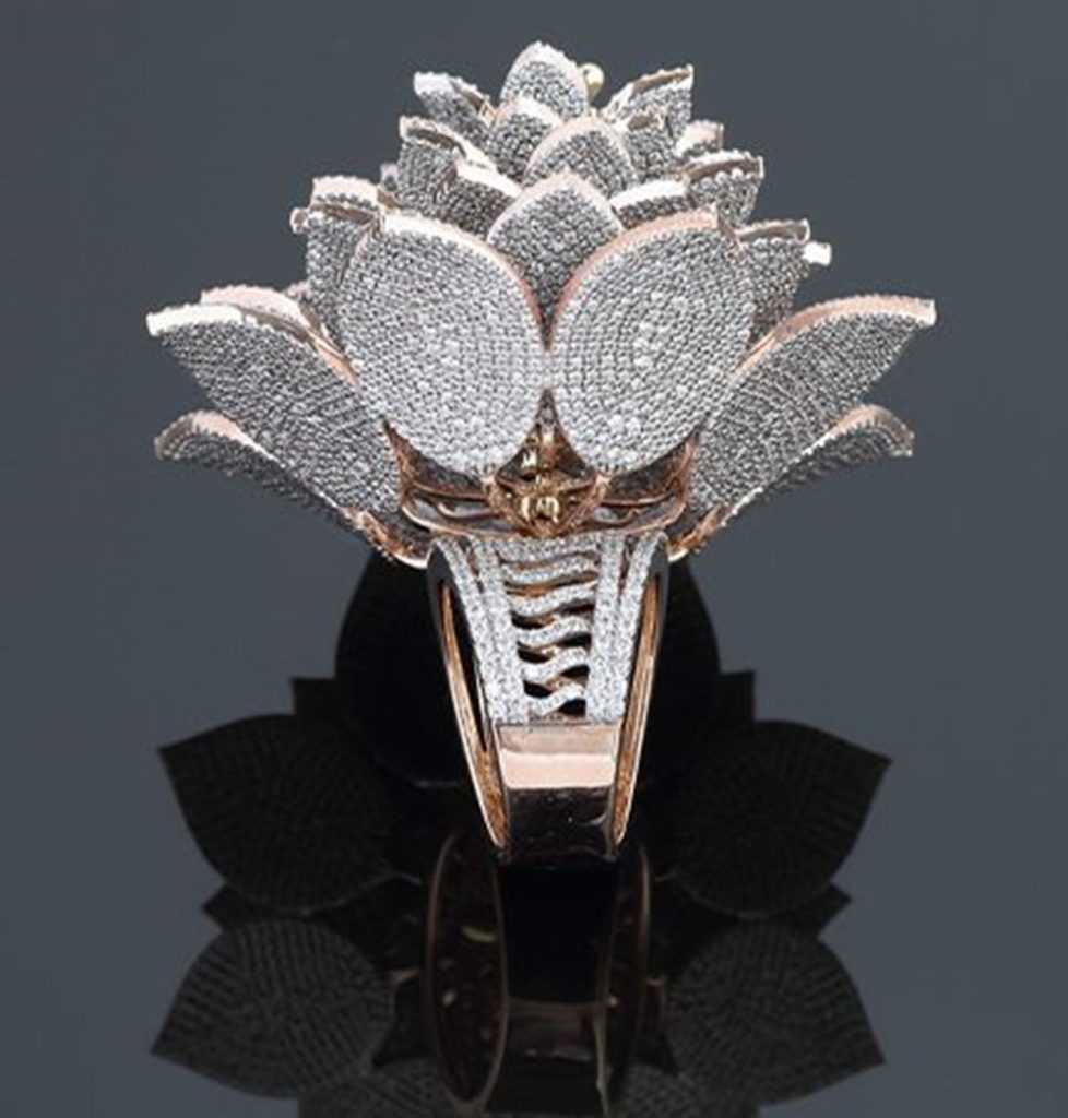 A jeweler in India, consisting of 6 different flower layers and having 7 thousand 801 diamonds on it. Entered the Guinness Book of Records with the gold ring.