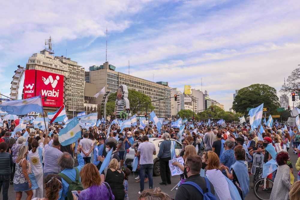 At the Obelisco obelisk in central Buenos Aires, the capital of Argentina. Demonstrators gathered under the title of “freedom, justice and constitution” and organized a protest called “banderazo” carrying the flag of Argentina.