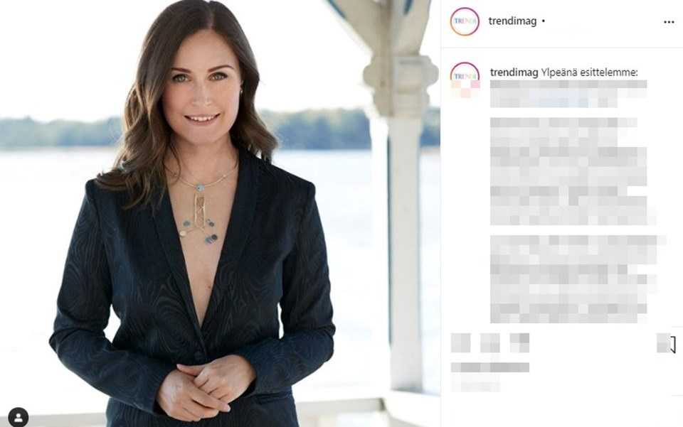 In the social media account of the magazine called Trendi. Photo of Sanna Marin wearing a black deep-necked jacket, seen wearing no bra. It soon criticized by thousands of social media users for being inappropriate for its position.